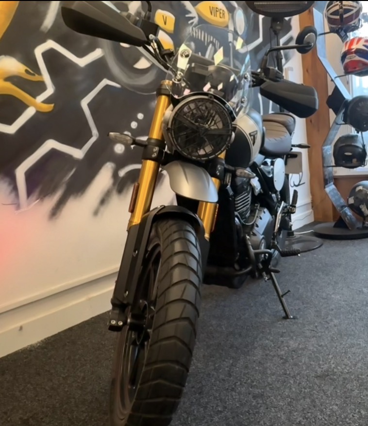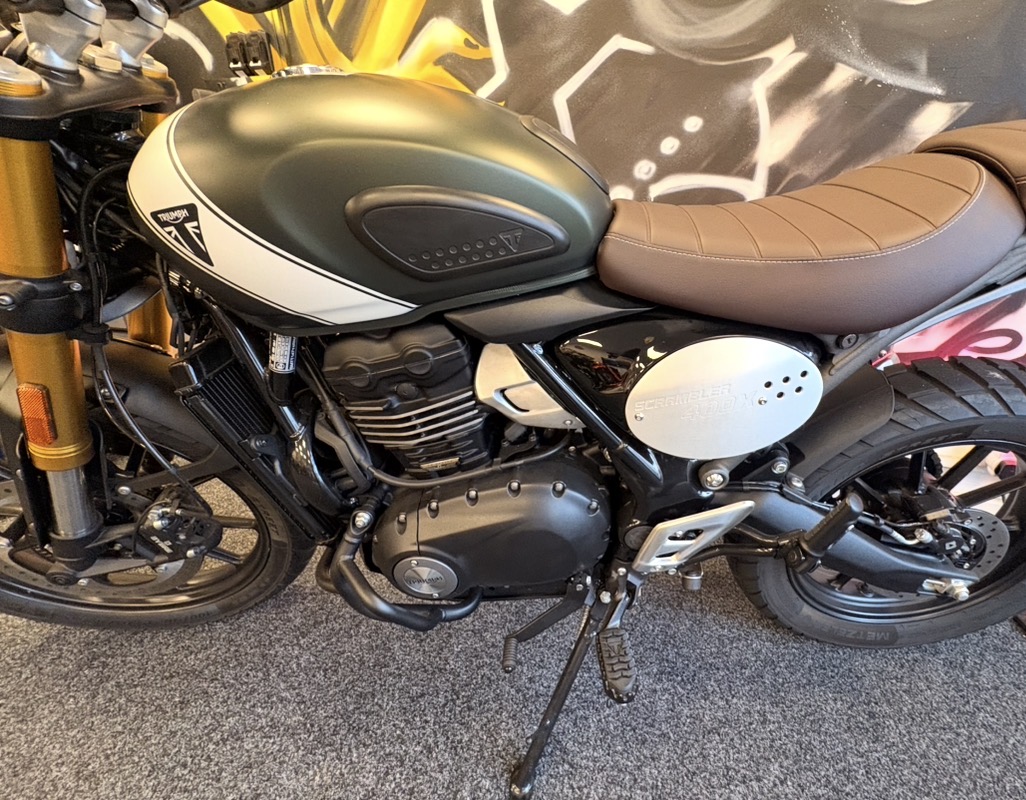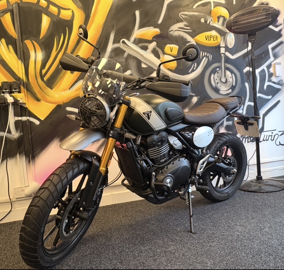 Almost brand-new, this Triumph Scrambler 400 has only 100 miles on the clock! Perfect for riders who want a classic scrambler look combined with modern performance.