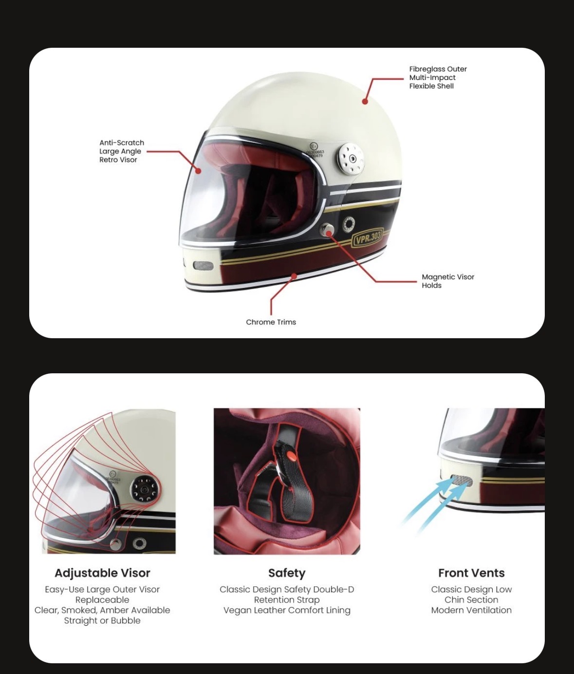 The VPR.303 F656 Vintage Helmet might catch your eye for several compelling reasons. First and foremost, its classic design offers a nostalgic nod to the golden era of motorcycling, making it a stylish choice for enthusiasts who appreciate both form and function. The helmet is crafted with fibreglass, ensuring durability and safety while providing a comfortable fit. Additionally, its classic racing look & design combined with modern features, such as advanced ventilation systems and lightweight construction, makes it not only a fashionable choice but also a practical one. Whether you’re cruising on a retro bike or simply want to stand out on the road, this helmet combines timeless appeal with contemporary comfort and protection.
